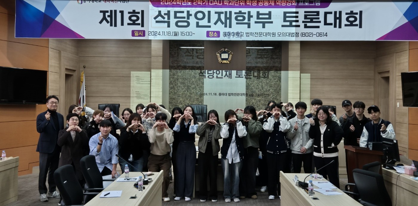 2026년 검사 임용 합격자(이다교) 석당인재학부 졸업생 "3년 연속" 검사 합격"2026년 검사 최종 합격" 이 * 교 동아대 법과대학 동문회, 제3회 유곡 박원영 교수 장학금 전달식 석당인재학부 공공정책학전공"석당인재학부 출신 2명, 법학전문대학원 장학금 수여" 2025-2학기 제 2회 석당인재 모의재판 석당인재학부 공공정책학전공"고급인재육성의 산실" 석당인재학부 2024-2학기 모의토론(2024.11.18) 석당인재학부 공공정책학전공"고급인재육성의 산실" 석당인재학부 2024학년도 2차 콜로키움(고대 신창섭 교수님) 석당인재학부 공공정책학전공"고급인재육성의 산실" 석당인재학부 2024-1학기 모의재판 석당인재학부 공공정책학전공"고급인재육성의 산실" 석당인재학부 메인비주얼1 석당인재학부 공공정책학전공"고급인재육성의 산실" 석당인재학부 메인비주얼 석당인재학부 공공정책학전공"고급인재육성의 산실" 석당인재학부 5 석당인재학부 공공정책학전공"고급인재육성의 산실" 석당인재학부 메인비주얼2 석당인재학부 공공정책학전공"고급인재육성의 산실" 석당인재학부 이전 장면 1 다음 장면 정지 재생 새로운 소식 공지사항 더 보기 학부행사 더 보기 석당소식 더 보기 이전 장면 다음 장면 정지 재생 교수소개 석당인재학부 입학안내 석당인재학부 장학안내 학부소개 포토갤러리 더 보기 학과소개 College of Seokdang Honors 25만 동문들의 염원을 실천하면서 명문사학의 전통을 잇고 21세기를 선도하는 학부로서 동아대학교 대표 학부로서 자리매김합니다. 학과 SNS 인스타그램 유튜브 이미지 배너2 준비중입니다. 전공연계도 교과과정 학사일정 진학 및 취업 이전 장면 다음 장면